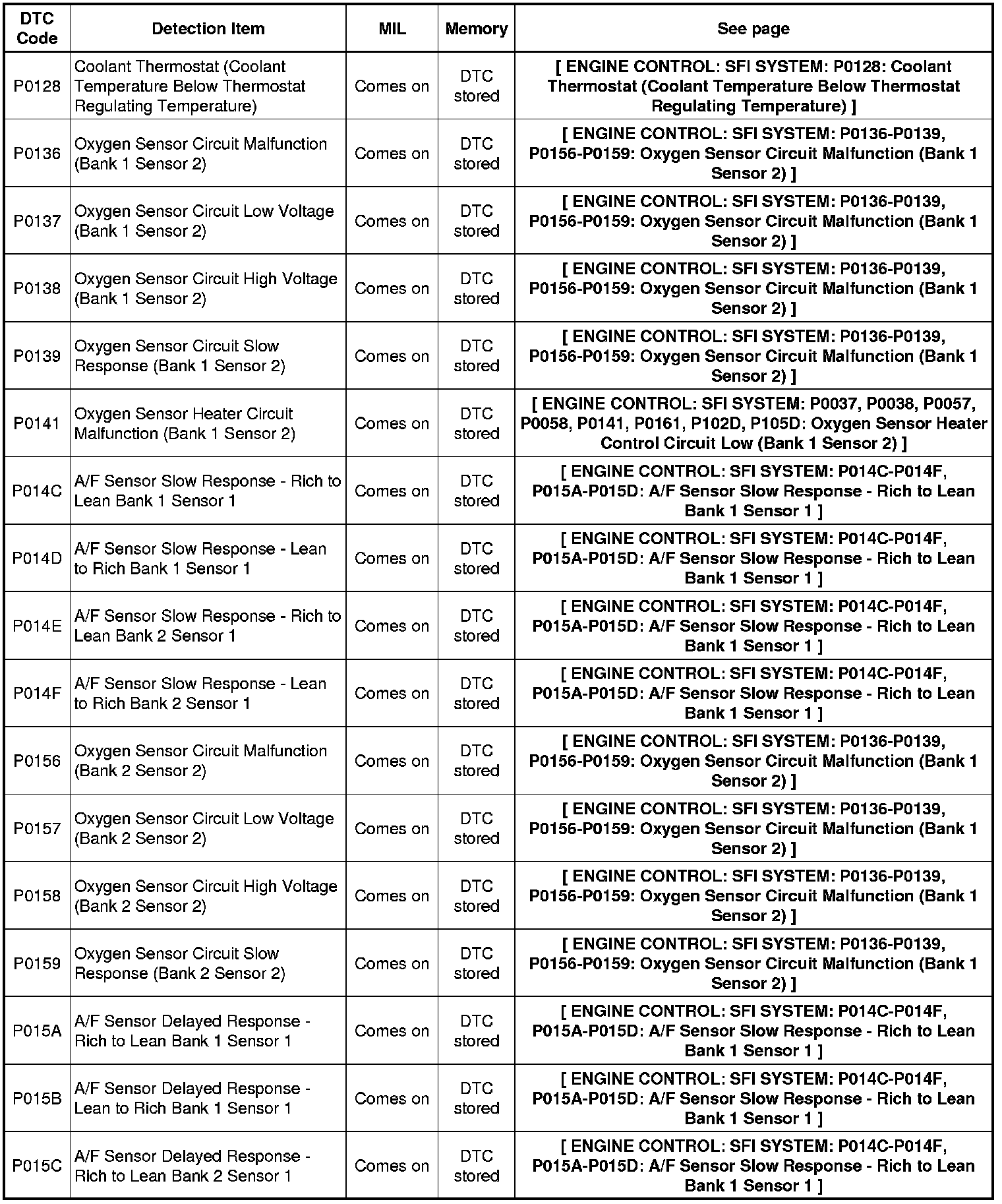 Parameters listed in the chart may not be exactly the same as your readings due to the type of instrument or other factors. If a trouble code is displayed during the DTC check, inspect the trouble areas listed for that code. For details of the code, follow the "See page" reference.