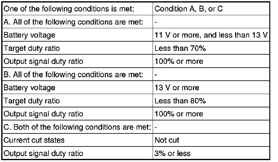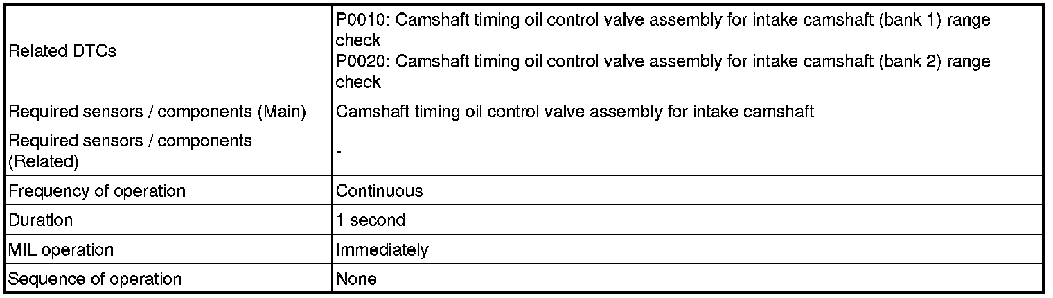 This DTC is designed to detect an open or short in the camshaft timing oil control valve assembly circuit. If the camshaft timing oil control valve assembly duty-cycle is excessively high or low while the engine is running, the ECM will illuminate the MIL and set the DTC.