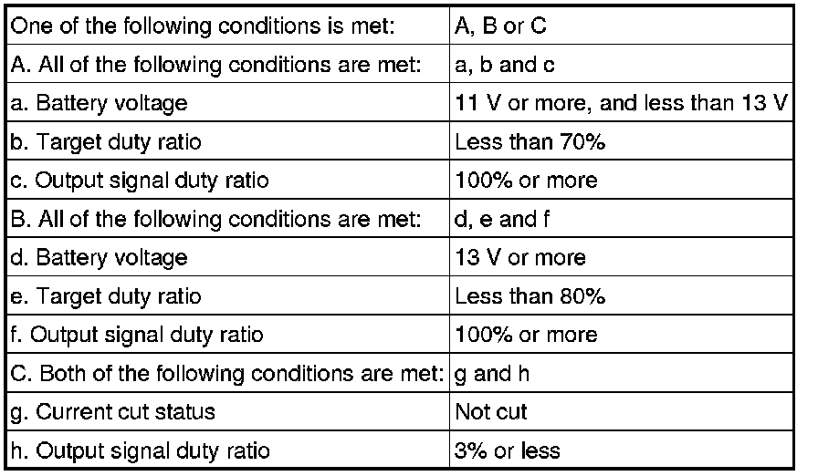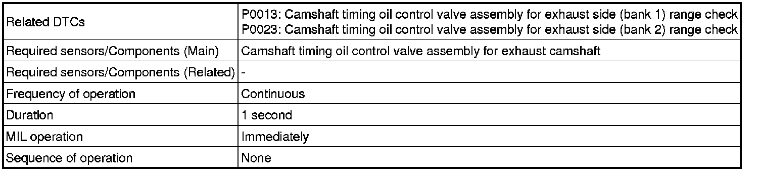 This DTC is designed to detect an open or short in the camshaft timing oil control valve assembly circuit. If the camshaft timing oil control valve assembly duty-cycle is excessively high or low while the engine is running, the ECM will illuminate the MIL and set the DTC.