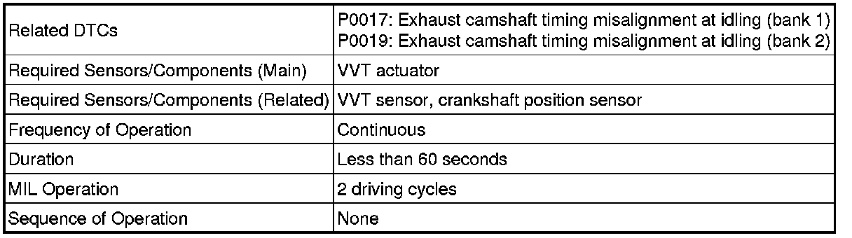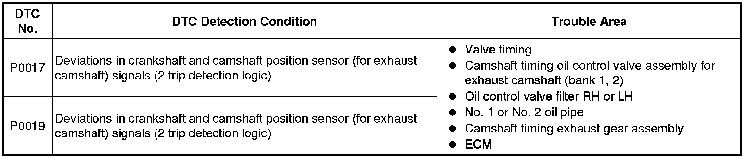 DTC P0017 or P0019 is output when foreign objects in engine oil are caught in some parts of the system. These codes will remain stored even if the system returns to normal after a short time. These foreign objects may then be captured by the oil filter, thus eliminating the source of the problem.