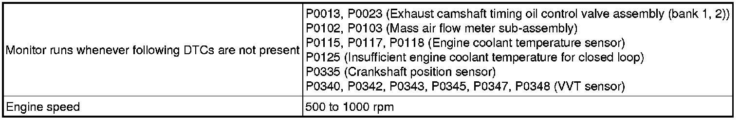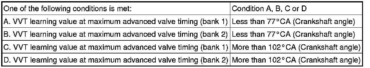 The ECM checks valve timing (VVT learning value) on the exhaust side while the engine is running at a low speed, in order to monitor the gap between the current and target valve timing on the exhaust side. The VVT learning value is calculated from the positions of the camshaft and crankshaft. The camshaft will come to the most retarded position when the engine is running at a low speed. If the camshaft position is normal, the VVT learning value should be within the specified range. If the VVT learning value is not within the specified range, the ECM determines this as a malfunction.