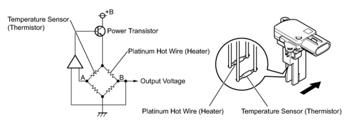 Inside the mass air flow meter sub-assembly, there is a heated platinum wire which is exposed to the flow of intake air.