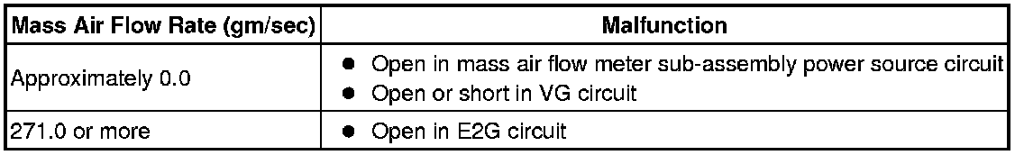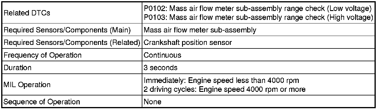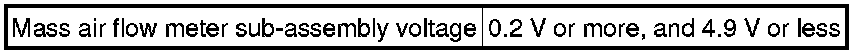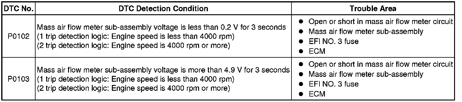 If there is a defect in the mass air flow meter sub-assembly or an open or short circuit, the voltage level deviates from the normal operating range. The ECM interprets this deviation as a malfunction in the mass air flow meter sub-assembly and sets a DTC.