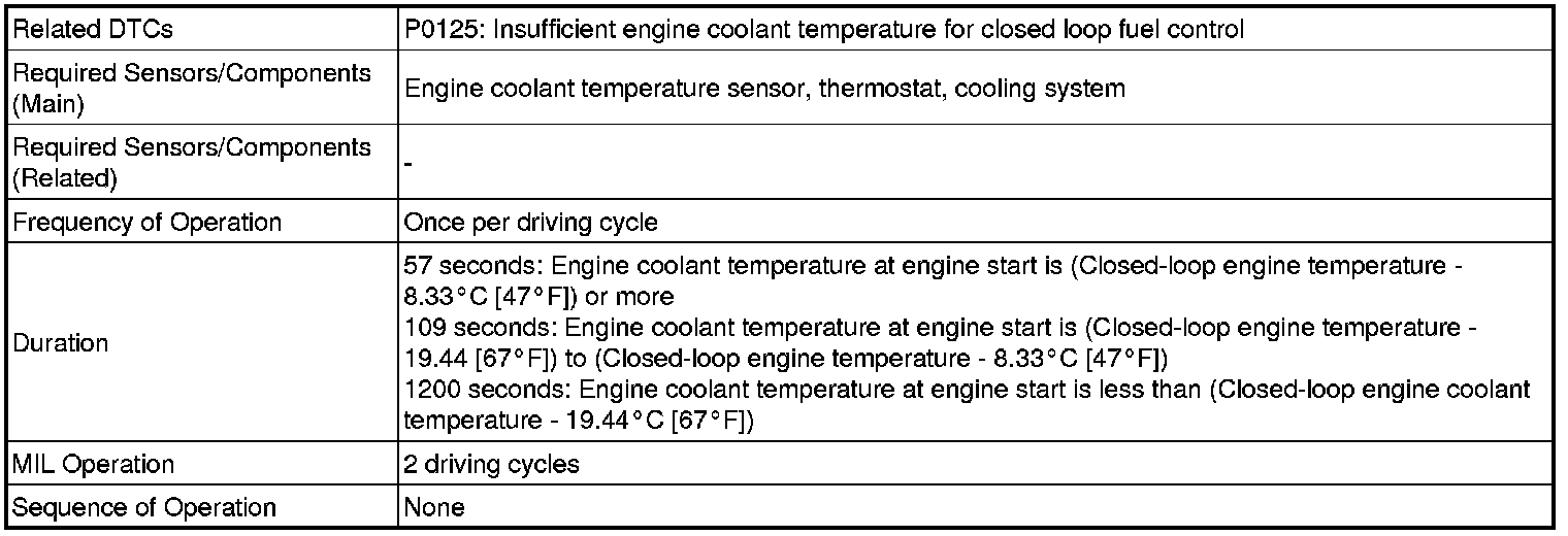 * If any of DTCs P0115, P0116, P0117 or P0118 are set simultaneously with DTC P0125, the engine coolant temperature sensor may have an open or a short circuit. Troubleshoot those DTCs first.