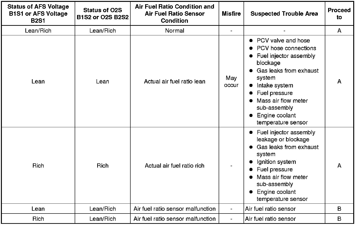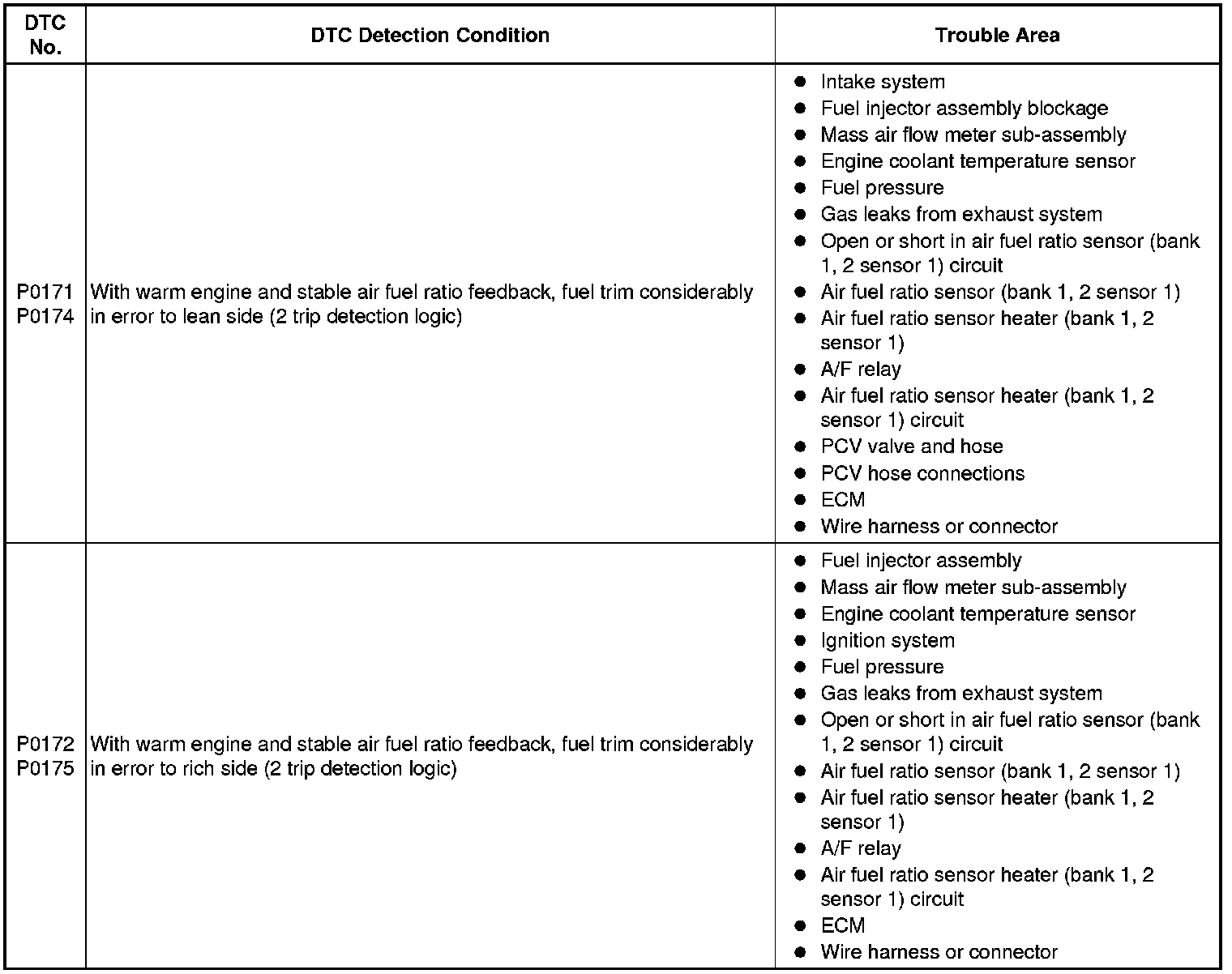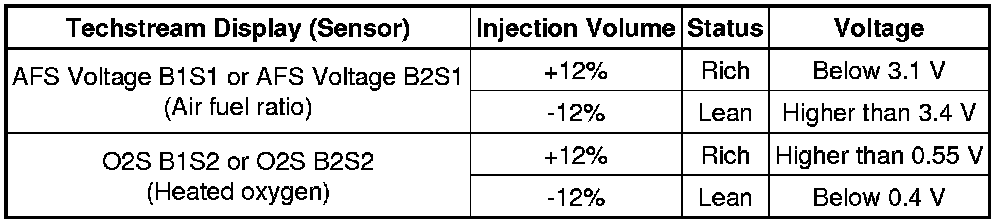 * When DTC P0171 or P0174 is set, the actual air fuel ratio is on the lean side. When DTC P0172 or P0175 is set, the actual air fuel ratio is on the rich side.