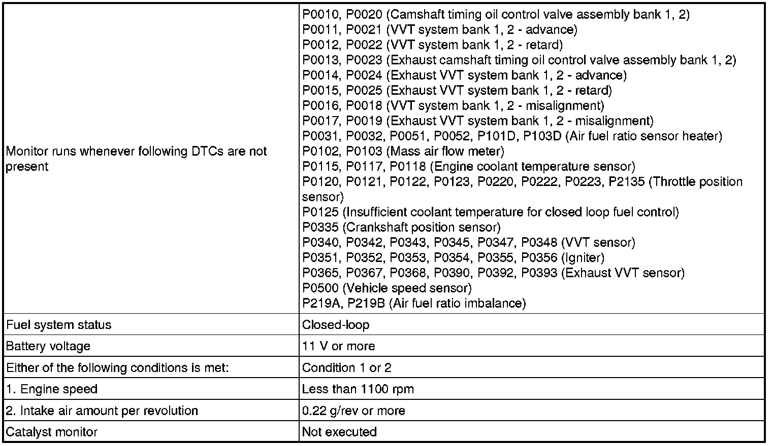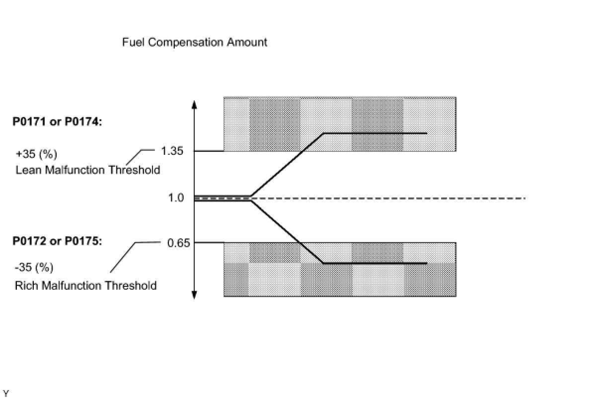 Under closed-loop fuel control, fuel injection volumes that deviate from those estimated by the ECM cause changes in the long-term fuel trim compensation value. The long-term fuel trim is adjusted when there are persistent deviations in the short-term fuel trim values. Deviations from the ECM's estimated fuel injection volumes also affect the average fuel trim learning value, which is a combination of the average short-term fuel trim (fuel feedback compensation value) and the average long-term fuel trim (learning value of the air fuel ratio). If the average fuel trim learning value exceeds the malfunction thresholds, the ECM interprets this as a fault in the fuel system and sets a DTC.
