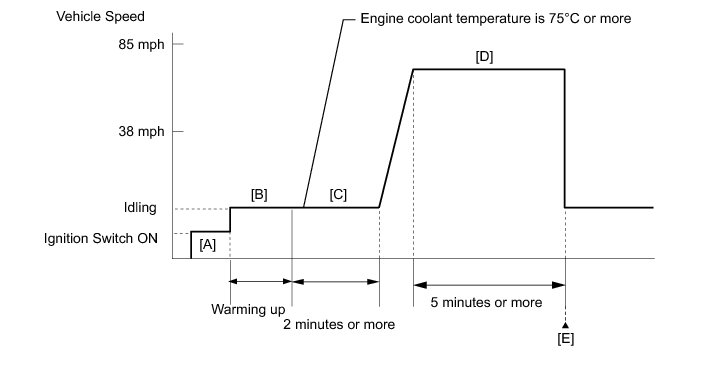 8. Drive the vehicle at a speed between 38 and 85 mph (60 and 135 km/h) for 5 minutes or more [D].