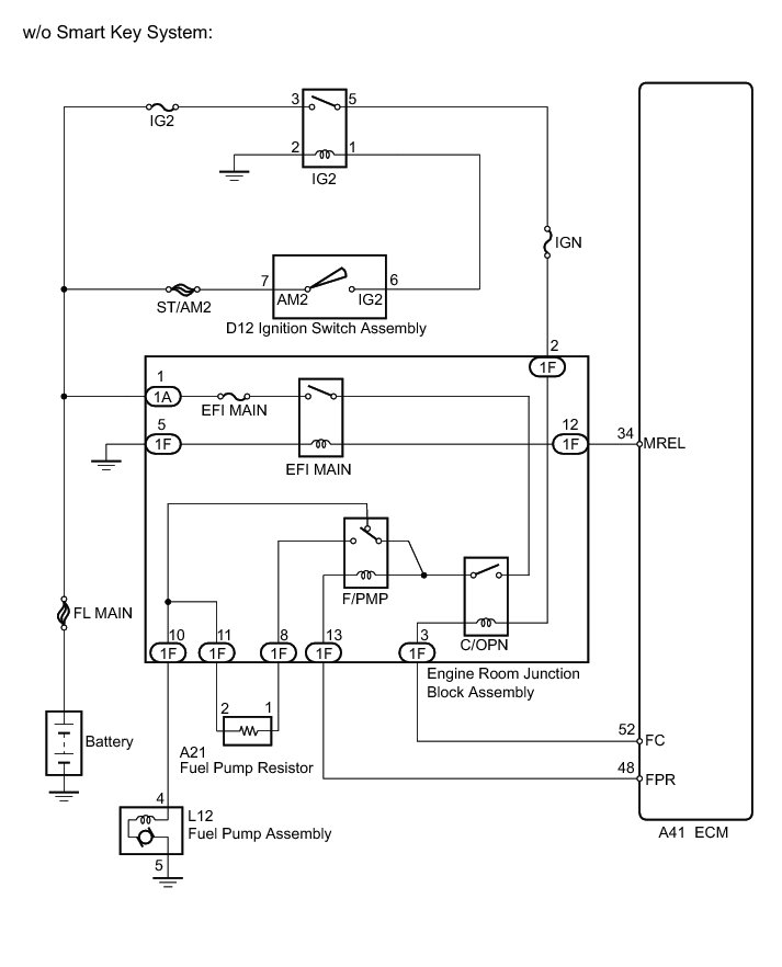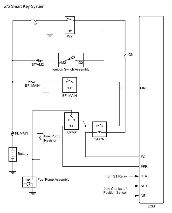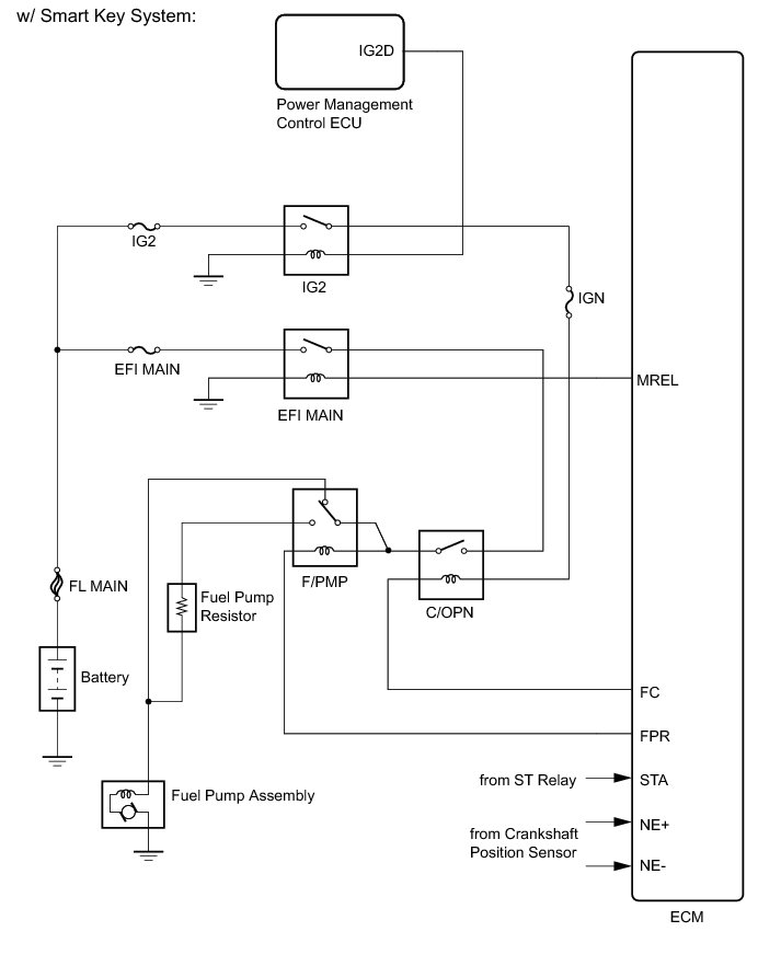 - The F/PMP relay switches the fuel pump speed according to the engine conditions. The fuel pump operates when the ECM receives the STA signal and NE signal. The F/PMP relay is turned on while the engine is idling or operating at low load. This causes current to flow through the fuel pump resistor to the fuel pump assembly. The fuel pump assembly then operates at low speed. The F/PMP relay is turned off while the engine is cranking or operating at high load. The fuel pump assembly then operates at normal speed.