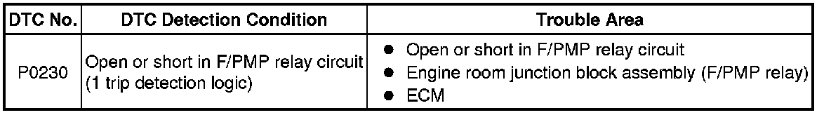 - This DTC is designed to detect a malfunction in the F/PMP relay circuit. When the system is normal, the battery voltage is applied to the ECM's FPR terminal of the ECM while the F/PMP relay is turned off. If battery voltage is not applied to the ECM's FPR terminal while the F/PMP relay is off, the ECM interprets this as a malfunction. The ECM then illuminates the MIL and sets a DTC.