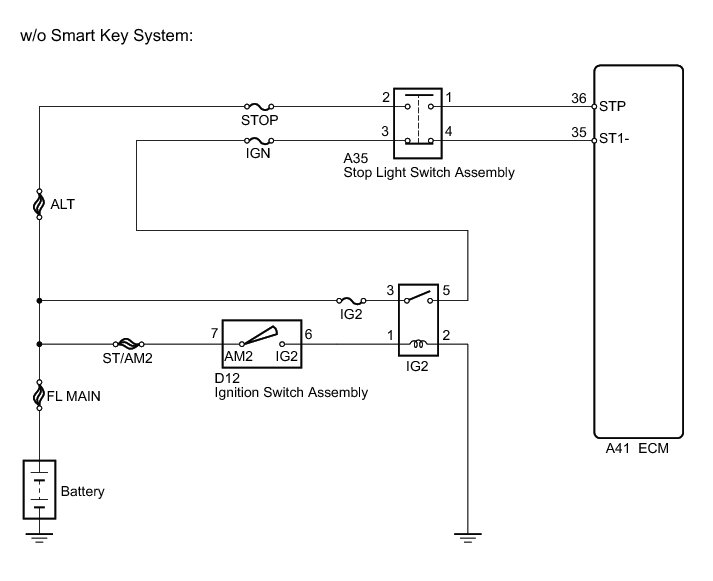 The stop light switch assembly is a duplex system that transmits 2 signals: STP and ST1-. These 2 signals are used by the ECM to monitor whether or not the brake system is working properly. If both signals, which indicate the brake pedal is being depressed or released, are detected simultaneously, the ECM interprets this as a malfunction in the stop light switch assembly and sets the DTC.