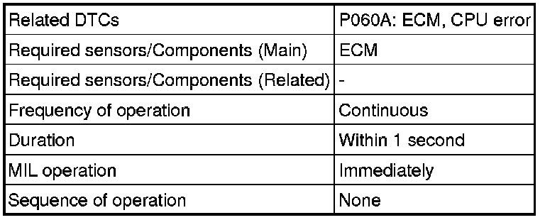 The main CPU and sub CPU of the ECM perform data communication between each other. The main CPU monitors the communication and WDC pulses from the sub CPU. When the malfunction below is detected, the DTC is stored.