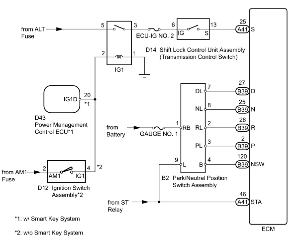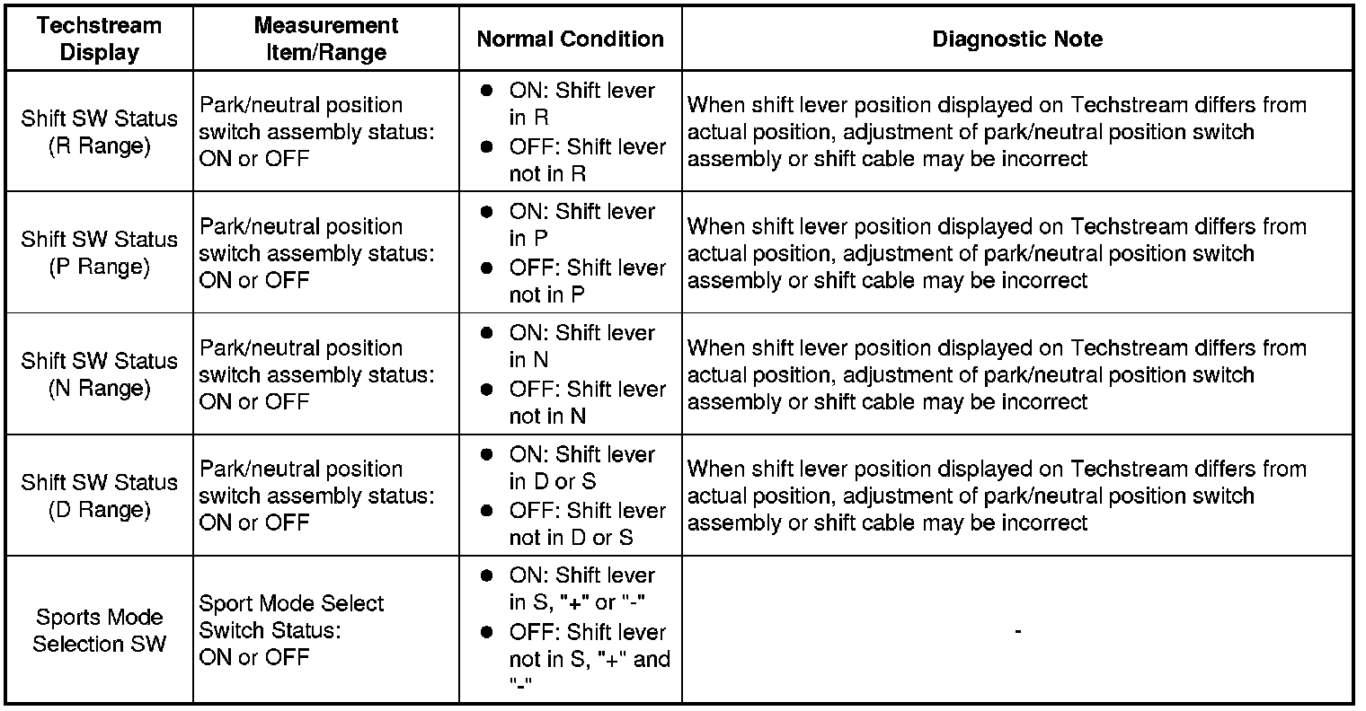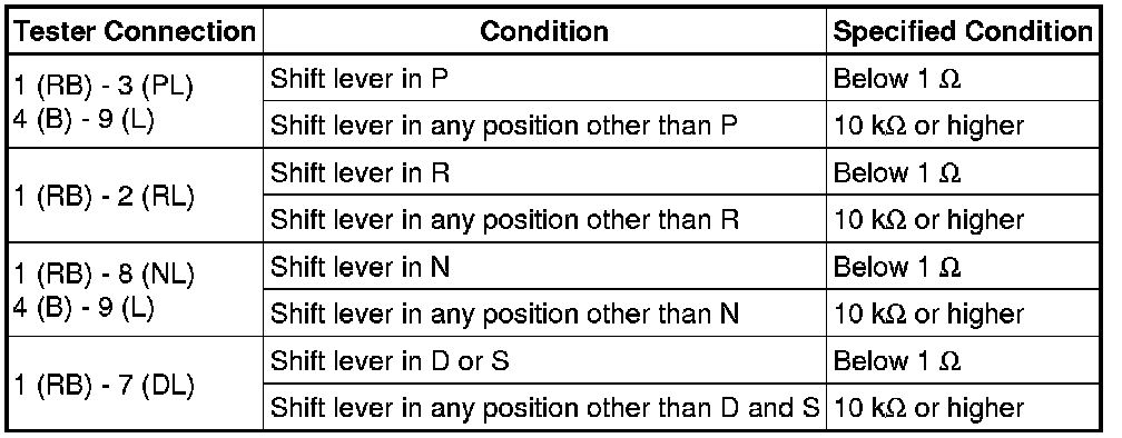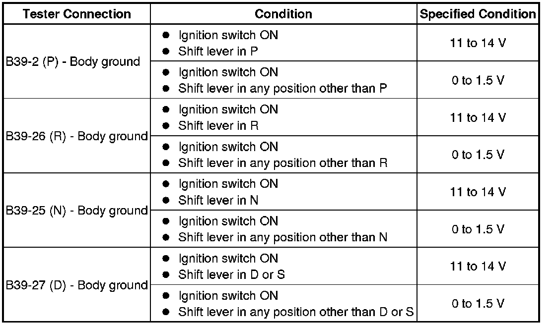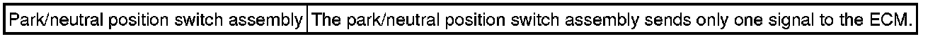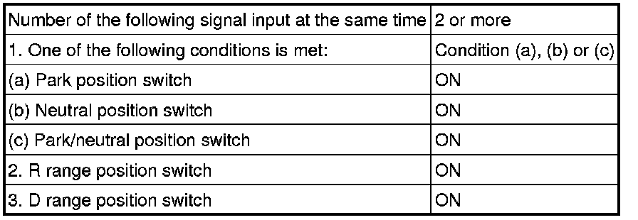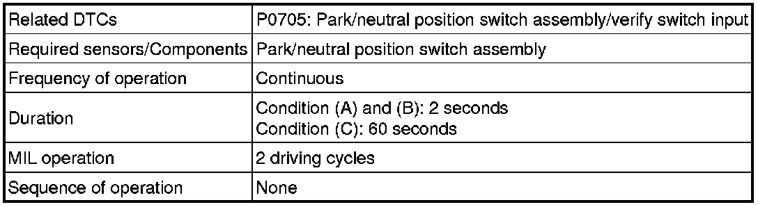 The park/neutral position switch assembly sends a signal to the ECM according to the shift lever position (P, R, N, D, or S). The ECM determines that there is a problem with the switch or related parts if it receives more than 1 position signal simultaneously. The ECM will turn on the MIL and store the DTC.