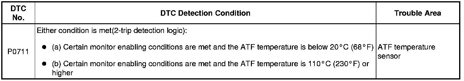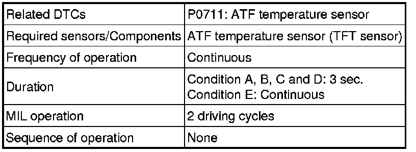 If a circuit related to the ATF temperature sensor becomes open, P0713 is immediately set (in 0.5 seconds). When P0713 is set, P0711 cannot be detected.