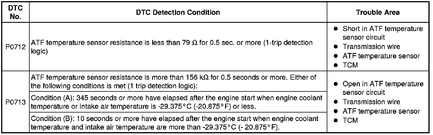 These DTCs indicate an open or short in the automatic transmission fluid (ATF) temperature sensor circuit. The automatic transmission fluid (ATF) temperature sensor converts ATF temperature into an electrical resistance value. Based on the resistance, the TCM determines the ATF temperature, and the TCM detects an open or short in the ATF temperature circuit. If the resistance value of the ATF temperature is less than 79 Ohms*1 or more than 156 kOhms*2, the TCM interprets this as a fault in the ATF sensor or wiring. The TCM will turn on the MIL and store the DTC.