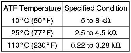 If the resistance is out of the specified range with the ATF temperature shown in the table below, the driveability of the vehicle may decrease.
