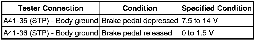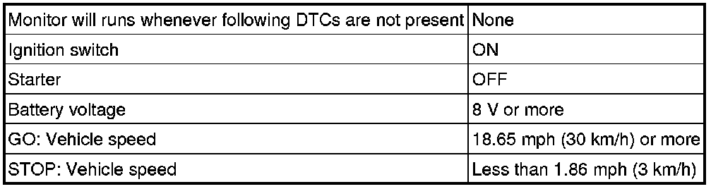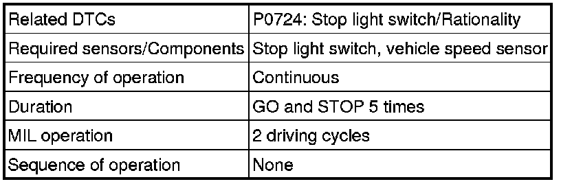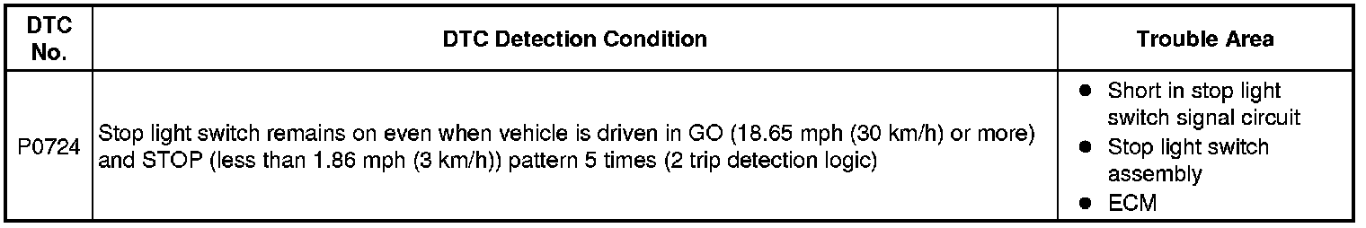 This DTC indicates that the stop light switch remains on. When the stop light switch remains on during "stop and go" driving, the ECM interprets this as a malfunction in the stop light switch and the MIL comes on and the ECM stores the DTC. The vehicle must stop (less than 1.86 mph (3 km/h)) and go (18.65 mph (30 km/h) or more) 5 times during 2 driving cycles, in order to detect a malfunction.
