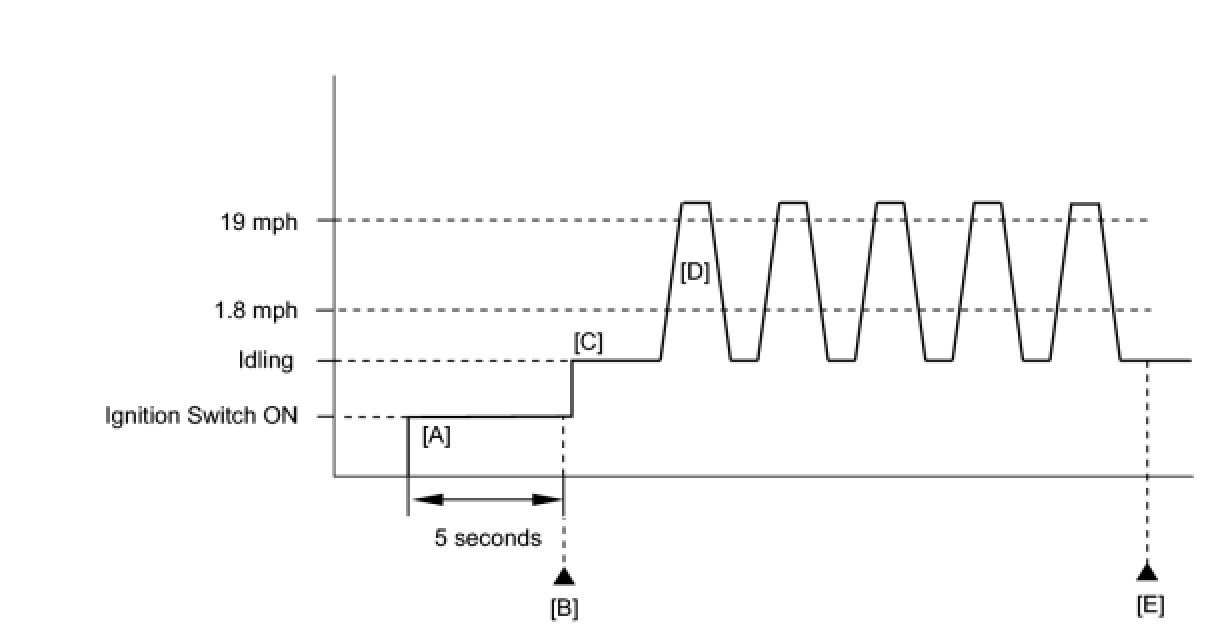 14. Accelerate the vehicle to 19 mph (30 km/h) or more, depress the brake pedal and decelerate the vehicle to 1.8 mph (3 km/h) or less [D]. Repeat step [D] 5 times.