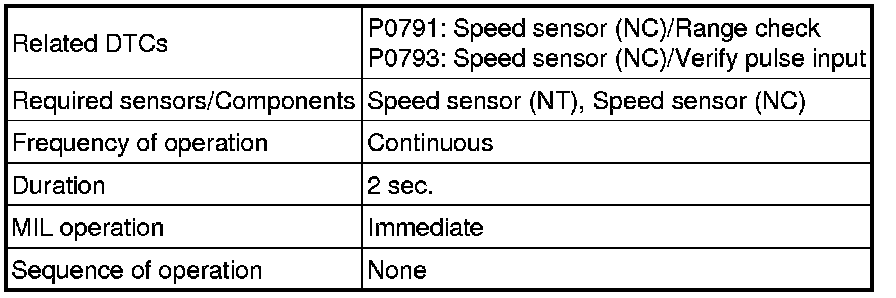 The NT terminal of the TCM detects a revolution signal from the speed sensor (NT) (input RPM). The TCM calculates a gear shifts by comparing the speed sensor (NT) with the speed sensor (NC).
