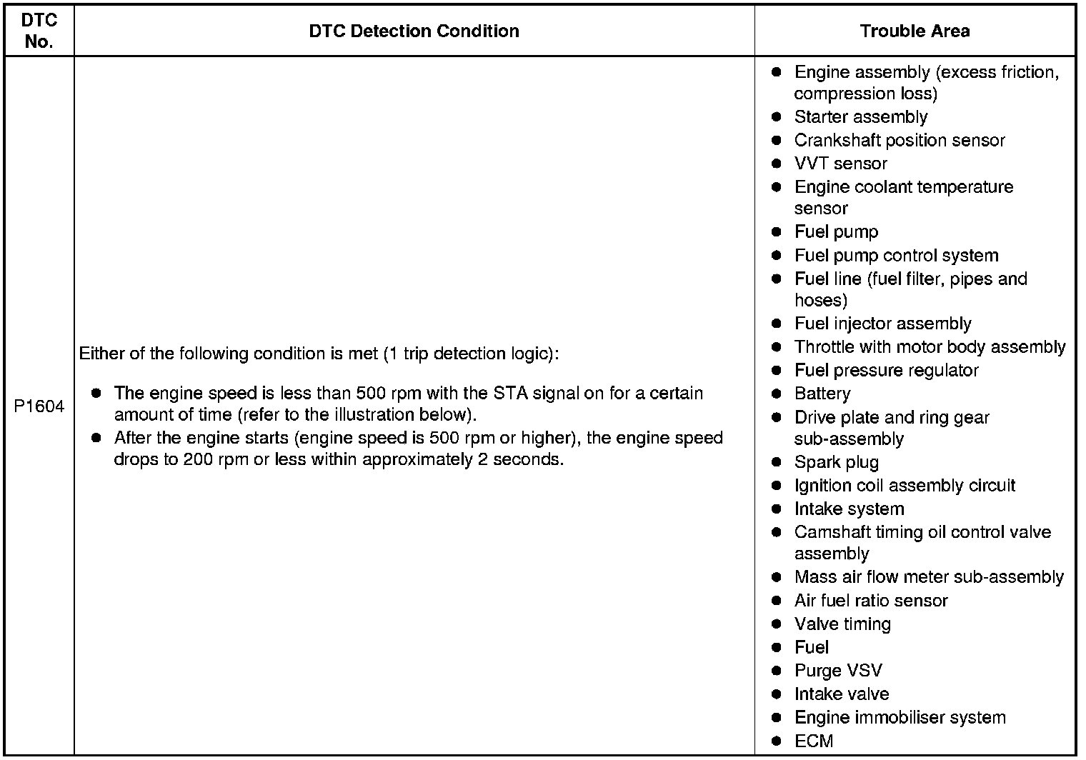 This DTC is stored when the engine does not start even though the STA signal is input or when the engine takes a long time to start, and when the engine speed is low or the engine stalls just after the engine starts.