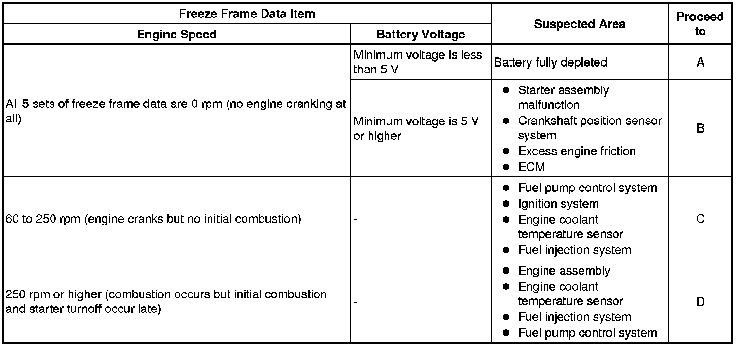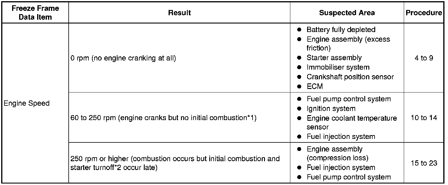 (3) The engine speed recorded in the freeze frame data is 250 rpm or higher (the initial combustion and starter turn off timing is too late).