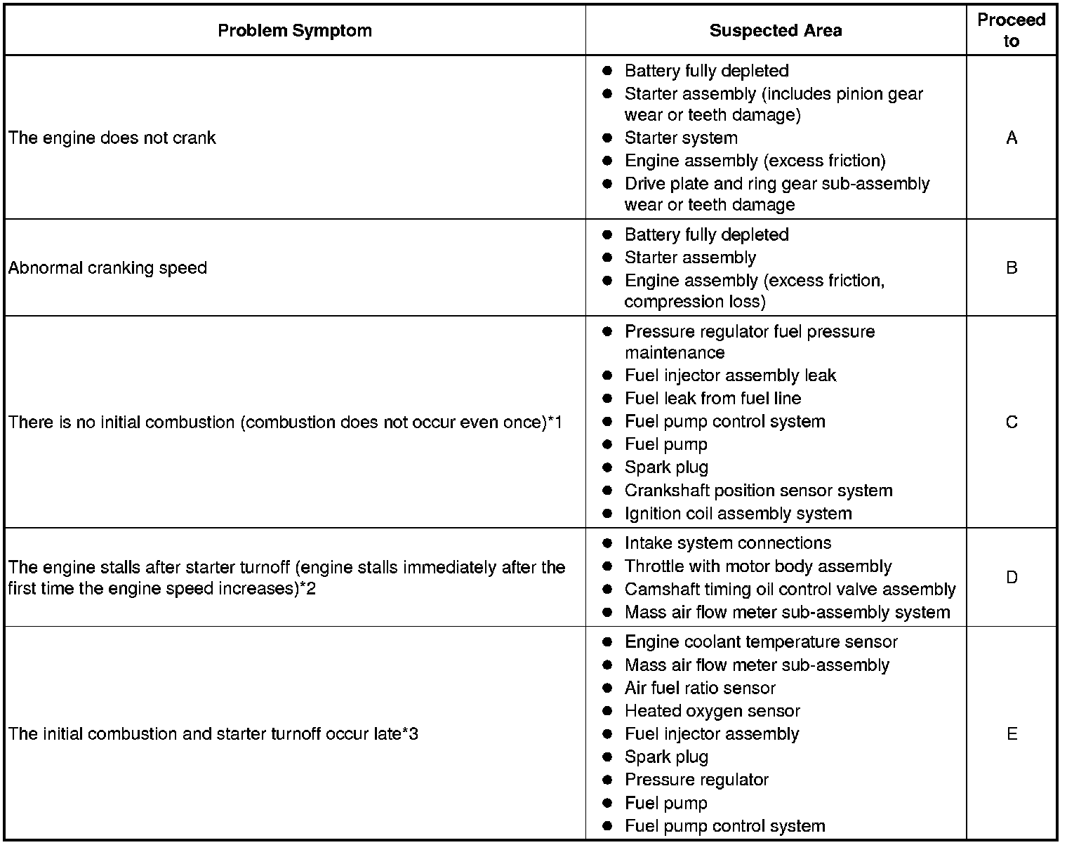 * *2: If the engine stalls after starter turn off, the air fuel ratio may be incorrect or the camshaft timing oil control valve may have a problem returning.