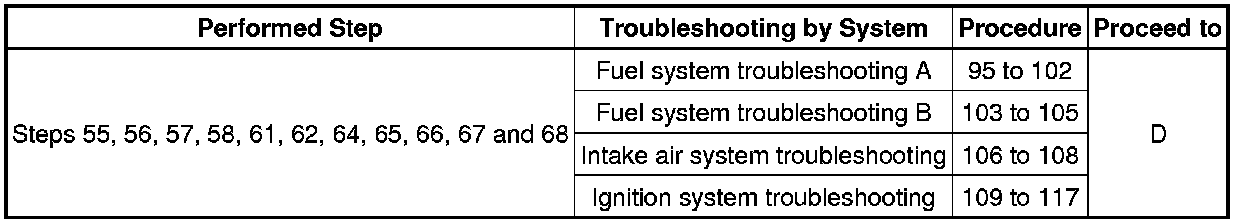 (d) If the malfunction could not be identified during the inspection in steps 55, 56, 57, 58, 61, 62, 64, 65, 66, 67 and 68, perform fuel system troubleshooting A (steps 95 to 102), fuel system troubleshooting B (steps 103 to 105), intake air system troubleshooting (steps 106 to 108), and ignition system troubleshooting (steps 109 to 117), in that order.