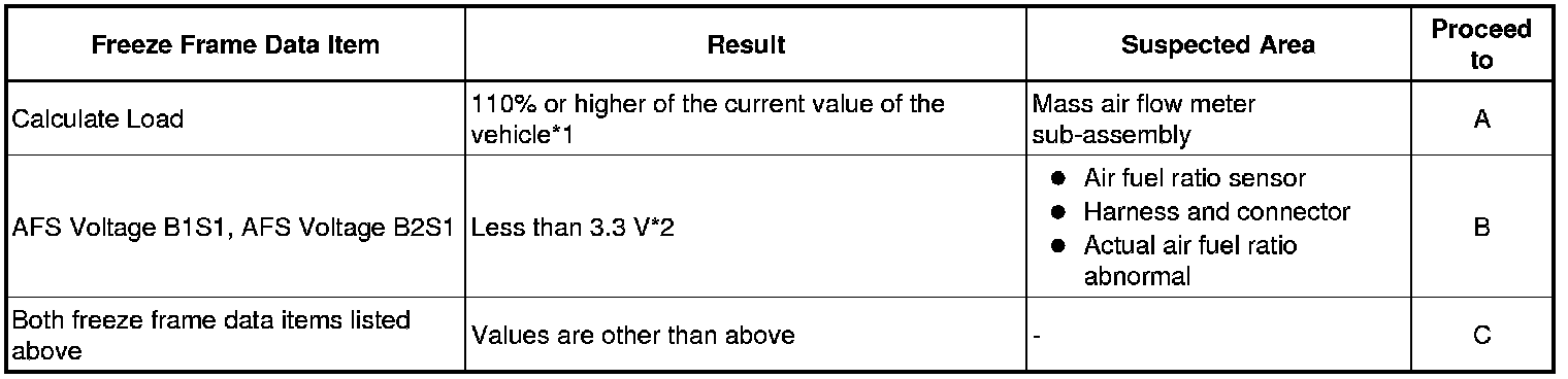 * *1: If the mass air flow meter sub-assembly is malfunctioning and incorrectly measures the intake air volume to be higher than the actual volume of air flowing through the intake air surge tank assembly, the freeze frame data will show a high engine load value.