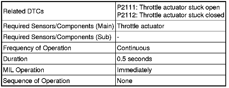 The ECM determines that there is a malfunction in the electronic throttle control system when the throttle valve remains at a fixed angle despite a high drive current from the ECM. The ECM illuminates the MIL and sets a DTC.
