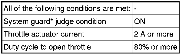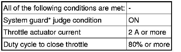 When either of these DTCs or other DTCs relating to electronic throttle control system malfunctions are stored, the ECM enters fail-safe mode. During fail-safe mode, the ECM cuts the current to the throttle actuator and the throttle valve is returned to a 6° throttle angle by the return spring. The ECM then adjusts the engine output by controlling the fuel injection (intermittent fuel-cut) and ignition timing in accordance with the accelerator pedal position to allow the vehicle to continue at a minimal speed. If the accelerator pedal is depressed firmly and gently, the vehicle can be driven slowly.