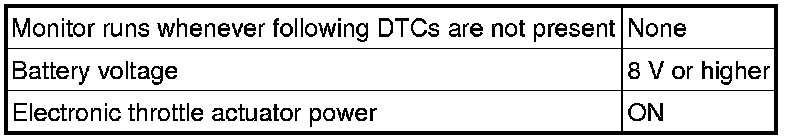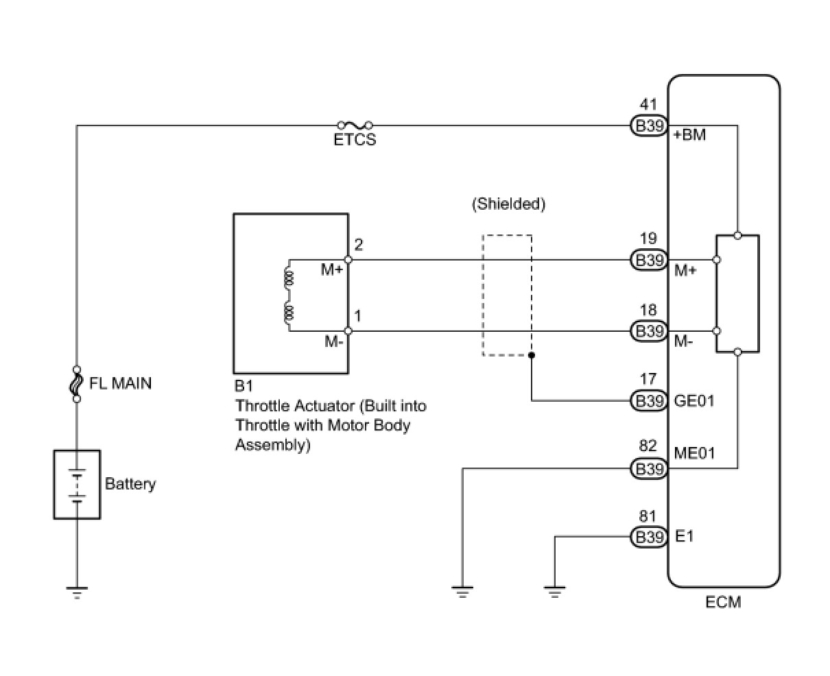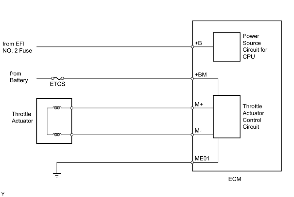 The electronic throttle control system has a dedicated power supply circuit. The voltage (+BM) is monitored and when it is low (below 4 V), the ECM determines that there is a malfunction in the electronic throttle control system and cuts off the current to the throttle actuator.
