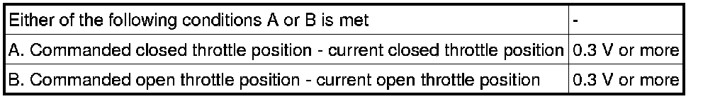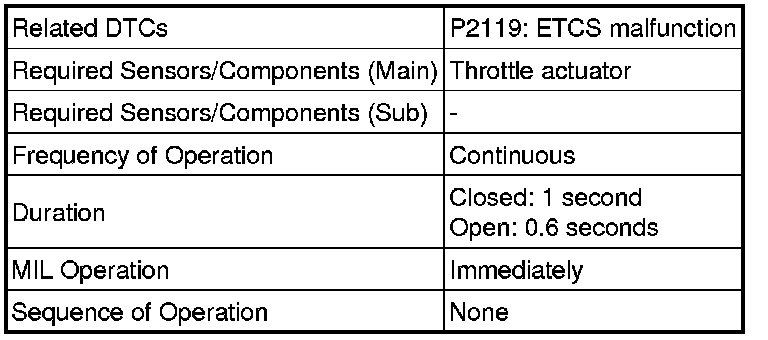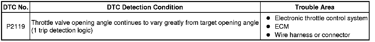 The ECM determines the actual opening angle of the throttle valve from the throttle position sensor signal. The actual opening angle is compared to the target opening angle commanded by the ECM. If the difference between these two values is outside the standard range, the ECM interprets this as a malfunction in the electronic throttle control system. The ECM then illuminates the MIL and sets the DTC.