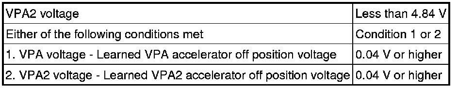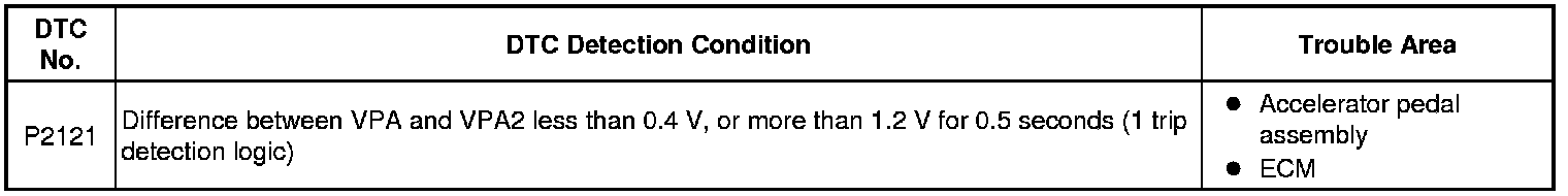 The accelerator pedal position sensor is mounted on the accelerator pedal bracket. The accelerator pedal position sensor has 2 sensor elements and 2 signal outputs: VPA and VPA2. VPA is used to detect the actual accelerator pedal angle (used for engine control) and VPA2 is used to detect malfunctions in VPA. When the difference between the voltage outputs of VPA and VPA2 deviates from the standard, the ECM determines that the accelerator pedal position sensor is malfunctioning. The ECM turns on the MIL and the DTC is set.