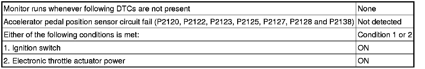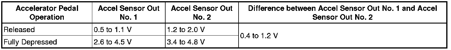 The accelerator pedal sensor assembly has 2 (main and sub) sensor circuits. If a malfunction occurs in either of the sensor circuits, the ECM detects the abnormal signal voltage difference between the 2 sensor circuits and switches to limp mode. In limp mode, the functioning circuit is used to calculate the accelerator pedal angle to allow the vehicle to continue driving. If both circuits malfunction, the ECM regards the angle of the accelerator pedal as being fully closed. In this case, the throttle valve remains closed as if the engine is idling. If a pass condition is detected and then the ignition switch is turned off, the fail-safe operation stops and the system returns to a normal condition.