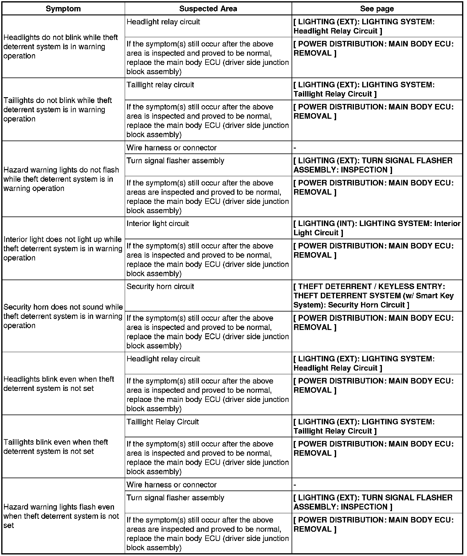 THEFT DETERRENT / KEYLESS ENTRY: THEFT DETERRENT SYSTEM (w/ Smart Key System): PROBLEM SYMPTOMS TABLE