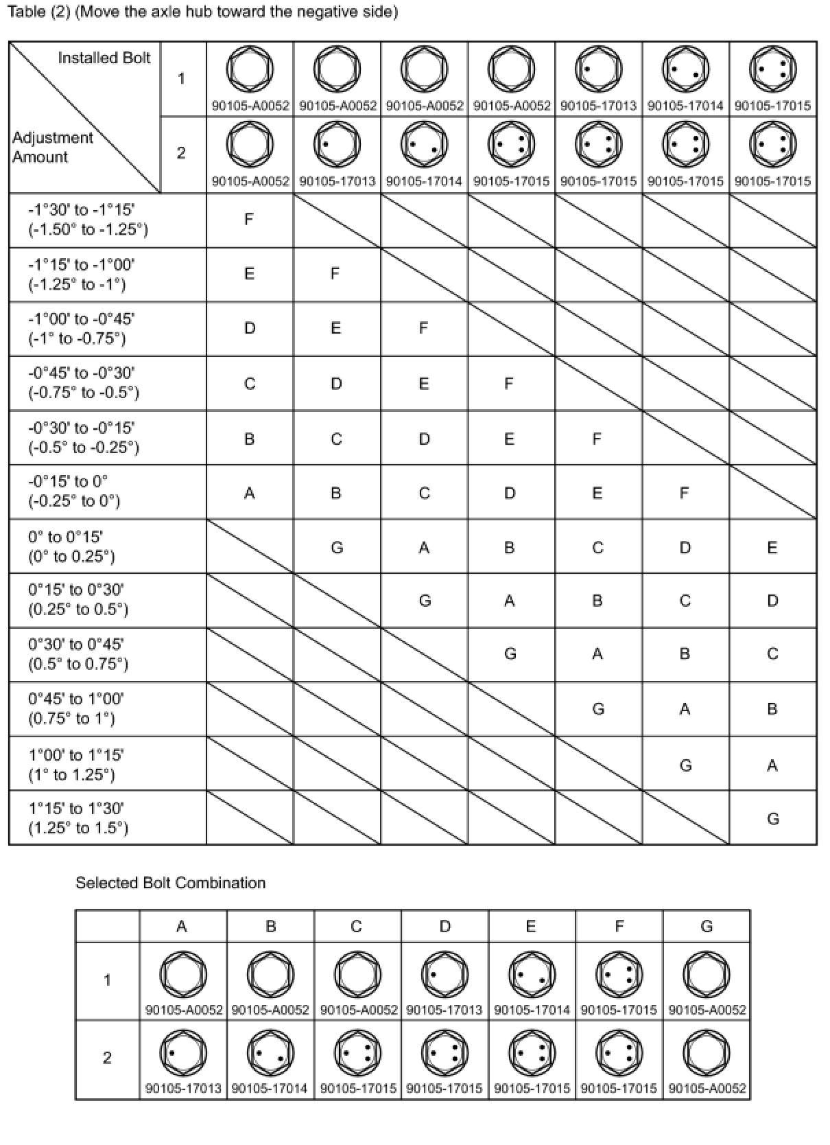 Check the combination of installed bolts. Select appropriate bolts from the table below to adjust the camber to the specified values.