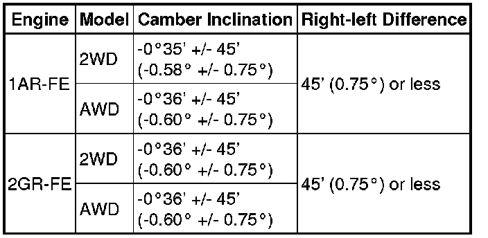 The body and suspension may be damaged if the camber is not correctly adjusted according to the above table.