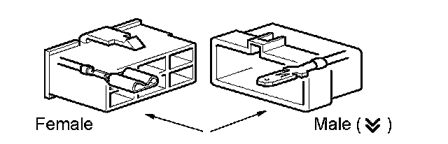 Symbol (Down Arrows) indicates the male terminal connector. Numbers outside connector codes indicate the pin numbers of both male and female connectors.