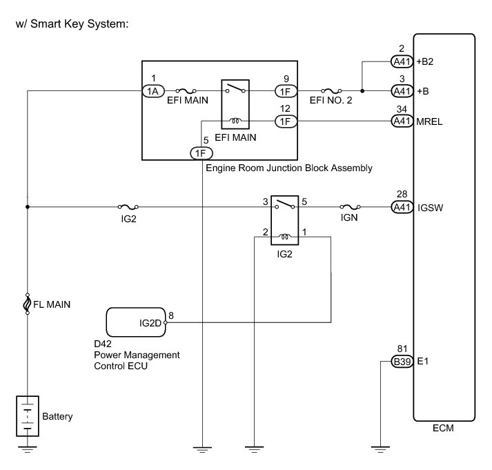 When the ignition switch is turned to ON, the battery voltage is applied to IGSW of the ECM. The output signal from the MREL terminal of the ECM causes a current to flow to the coil, closing the contact of the engine room junction block assembly (EFI MAIN relay) and supplying power to terminals +B and +B2 of the ECM.