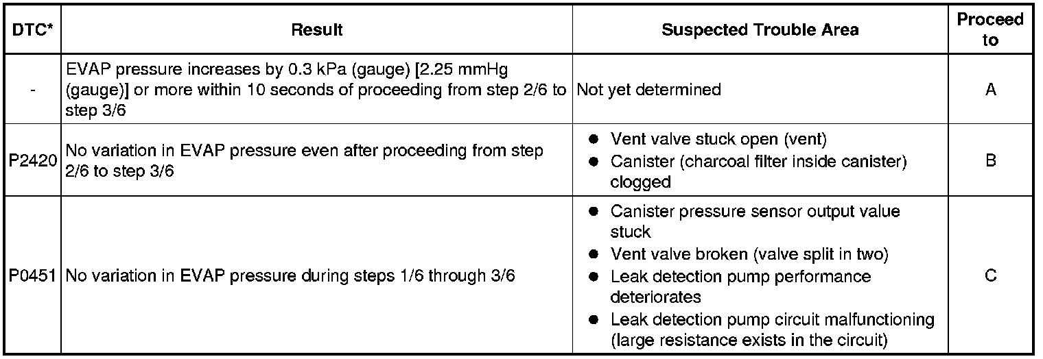 If any EVAP system DTCs are stored, the malfunctioning area can be determined using the table below.