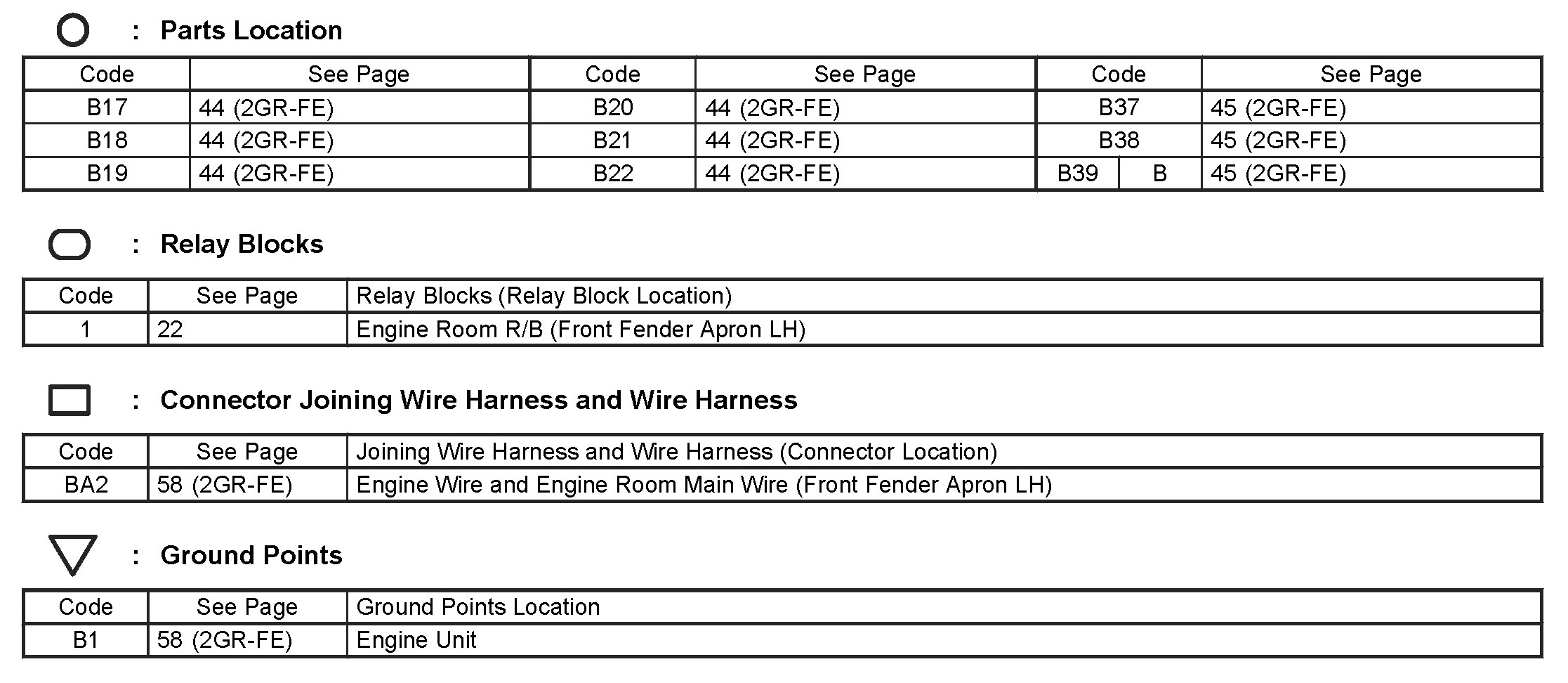 Locations: The locations of components, connectors, ground points, and splices referred to within these diagrams can be found at Vehicle Locations. Locations