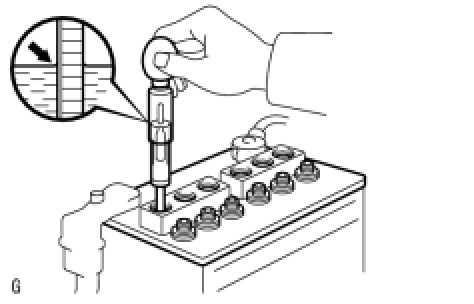 If the electrolyte quantity is above the lower line, check the battery voltage when cranking the engine. If the voltage is less than 9.6 V, recharge or replace the battery.