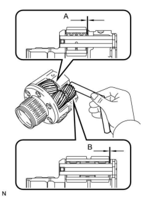 (a) Using a feeler gauge, measure the clearance between the planetary gear case and each pinion gear at points A and B.