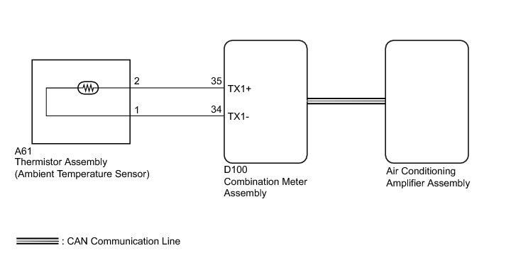 The combination meter assembly applies a voltage (5 V) to the thermistor assembly (ambient temperature sensor) and reads voltage changes as changes in the resistance of the thermistor assembly (ambient temperature sensor). The combination meter assembly sends these signals to the air conditioning amplifier assembly.