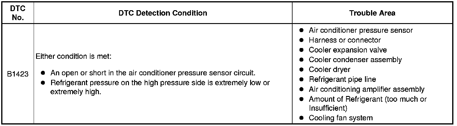 This DTC is stored when refrigerant pressure is extremely low (0.176 MPa [1.8 kgf/cm2, 25.5 psi] or less) or extremely high (3.03 MPa [30.9 kgf/cm2, 439.4 psi] or higher). The air conditioner pressure sensor, which is installed on the pipe of the high pressure side to detect refrigerant pressure, outputs the refrigerant pressure signal to the air conditioning amplifier assembly. The air conditioning amplifier assembly converts the signal to a pressure value according to the sensor characteristics to control the compressor.