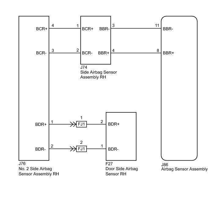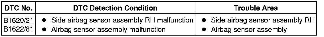 The side collision sensor RH circuit (to determine deployment of the front seat side airbag assembly RH and curtain shield airbag assembly RH) is composed of the airbag sensor assembly, side airbag sensor assembly RH and rear airbag sensor RH. The side airbag sensor assembly RH detects impacts to the vehicle and sends signals to the airbag sensor assembly to determine if the airbag should be deployed. DTC B1620/21 or B1622/81 is stored when a malfunction is detected in the side collision sensor RH circuit.
