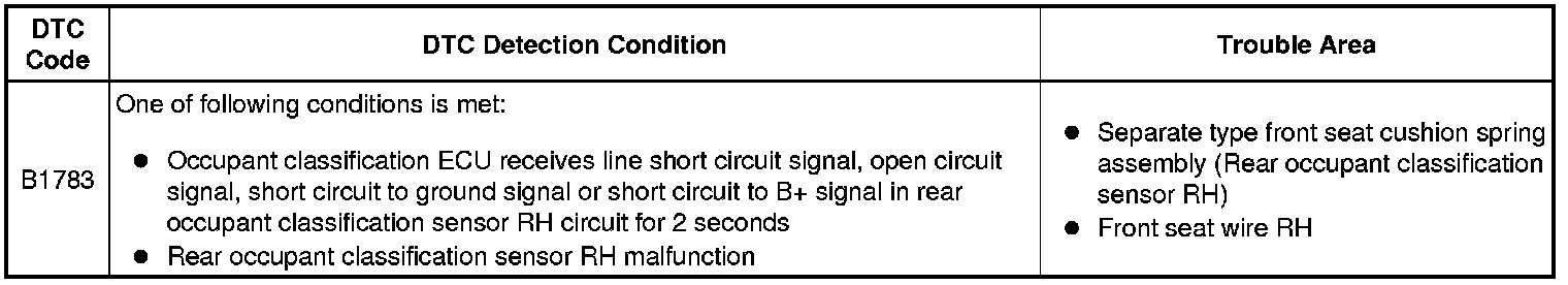 DTC B1783 is stored when a malfunction is detected in the rear occupant classification sensor RH circuit.