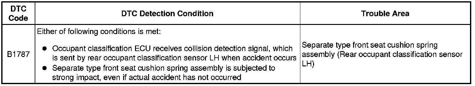 DTC B1787 is stored when the occupant classification ECU receives a collision detection signal, which is sent by the rear occupant classification sensor LH when an accident occurs.