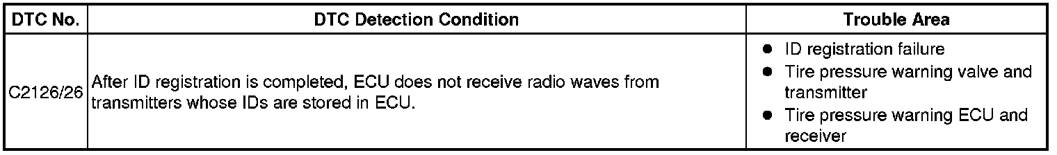 The purpose of this DTC is to help prevent delivering a vehicle that has incorrectly registered IDs. After all IDs are registered, DTC C2126/26 is detected and the tire pressure warning light blinks for 1 minute and then illuminates. If the tire pressure warning light does not turn off after a little while, IDs may be incorrectly registered.