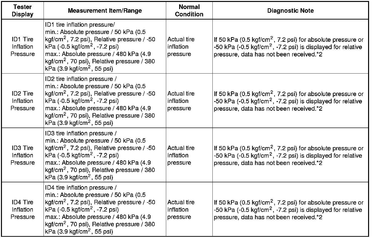 * Record the "ID Tire Inflation Pressure" data transmitter ID that corresponds to each tire.