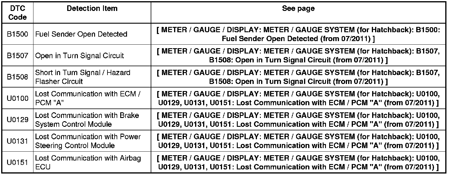 METER / GAUGE / DISPLAY: METER / GAUGE SYSTEM (for Hatchback): DIAGNOSTIC TROUBLE CODE CHART